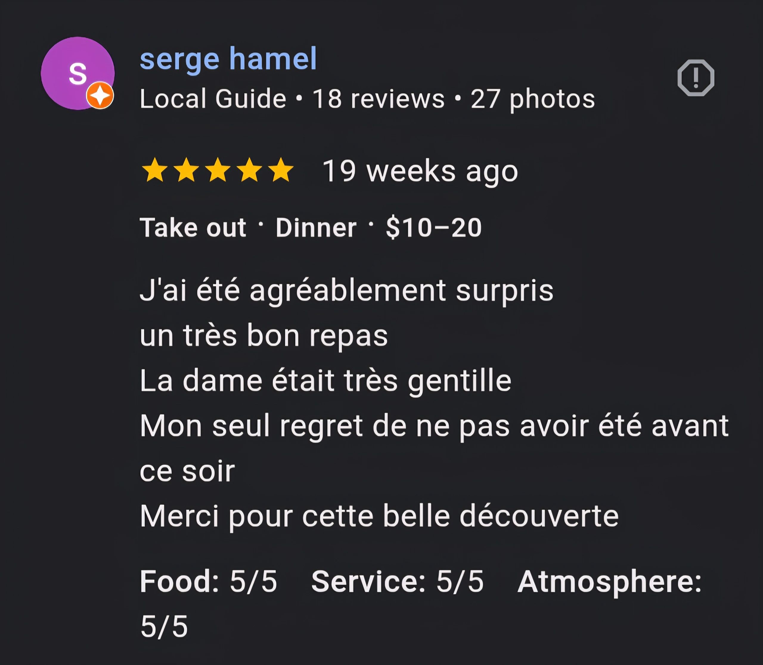 Nous servons des plats à emporter cependant, nous avons des tables si vous choisissez de manger sur place. We serve take-out meals however, we do have tables if you choose to eat on site.